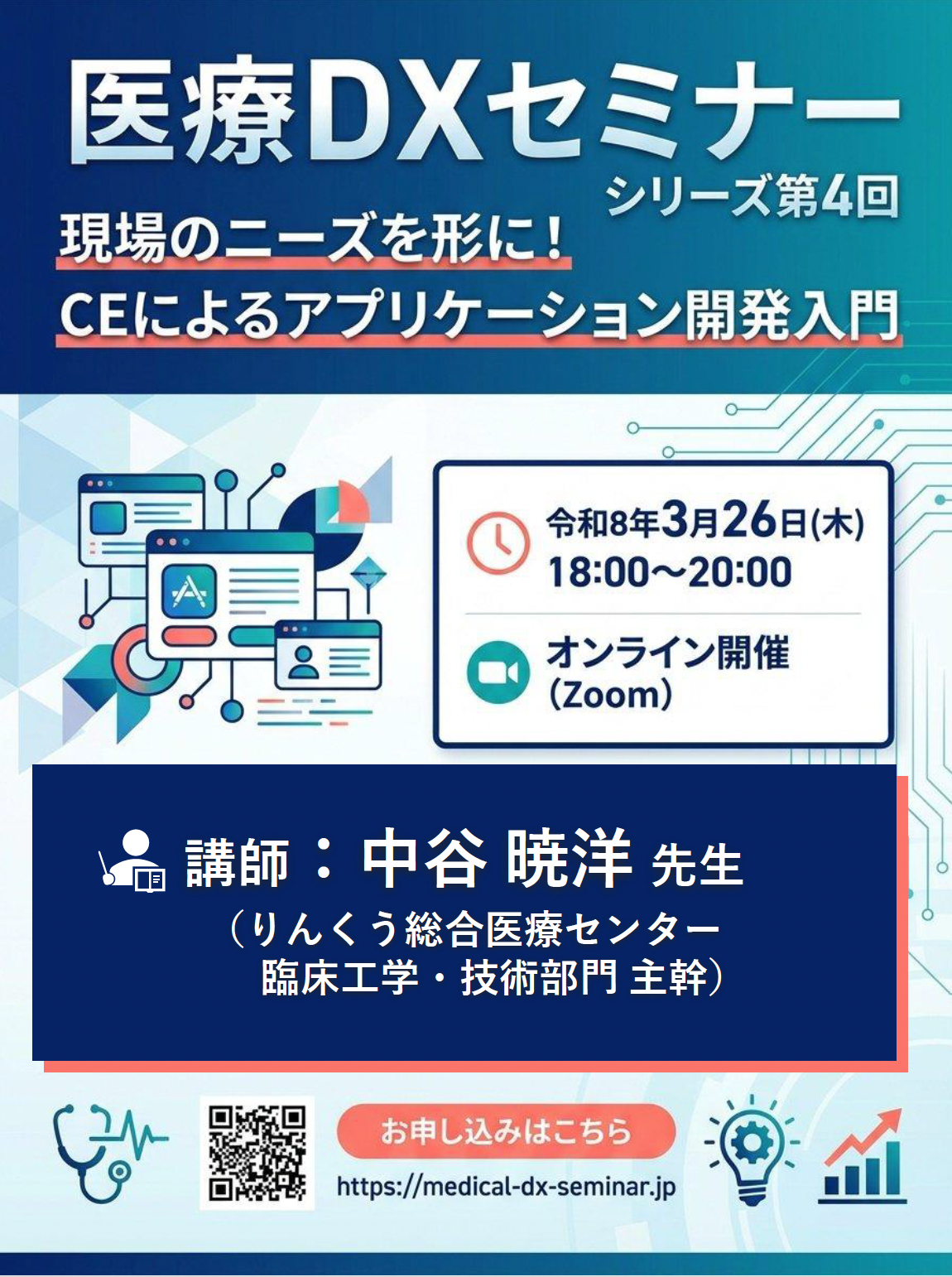 | 開催名 | 医療DXセミナーシリーズ 第4回〜現場のニーズを形に!CEによるアプリケーション開発入門〜 |